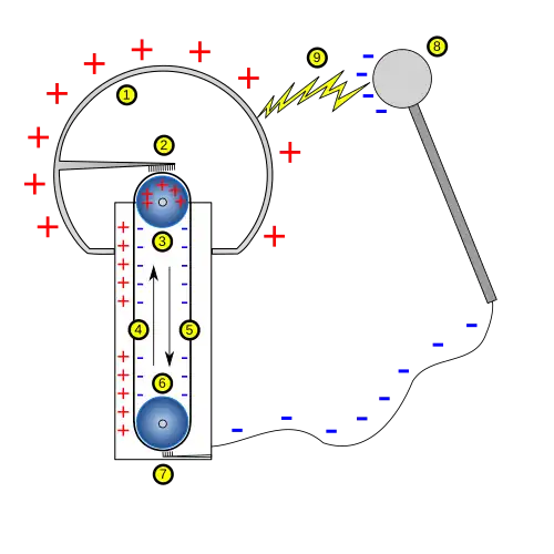 Cette tension élevée ionise l'air près de la pointe de E1 ce qui permet de pousser les charges positives vers la courroie et de permettre leur déplacement sur la face interne de l'enveloppe sphérique. Cette charge positive sur la sphère induit une charge négative sur l'électrode E2. La forte différence de potentiel ionise l'air à l'intérieur de la sphère et les charges négatives sont repoussées sur la courroie, ce qui a pour effet de la décharger. Selon le principe de la cage de Faraday, les charges positives de E2 migrent vers la sphère indépendamment de la tension existante à sa surface. Comme la courroie continue à tourner, un courant constant arrive par ce moyen en direction de la boule qui continue de recevoir des charges positives. Ce chargement se poursuit jusqu'à un certain point qui dépend des caractéristiques de la sphère. Plus l'enveloppe sphérique est grande, plus son potentiel est élevé. Avec une surface parfaite pour la boule métallique, la tension maximale est de l'ordre de 30 kV pour chaque centimètre de rayon[1]. Cette valeur théorique n'est pas atteinte en pratique à cause des imperfections du système (surface irrégulière, pertes, etc.)
