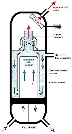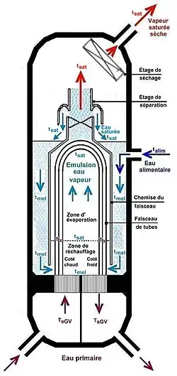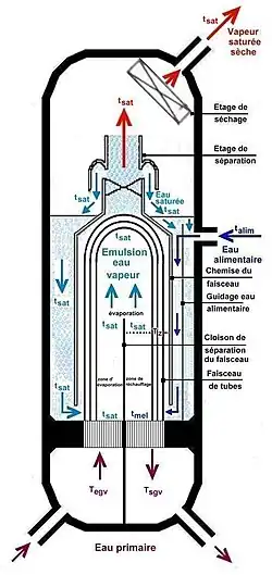L'eau du circuit secondaire ("eau alimentaire") entre dans le GV en partie supérieure au-dessus de l'altitude du sommet de faisceau des tubes, généralement sous le niveau d'eau. Elle s'échappe sous forme de vapeur sous pression au sommet du GV.