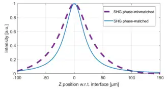 Dans le cas particulier de SHG (n = 2), dans un milieu de longueur L et une position focale à , l'intensité s'écrit[23] : .