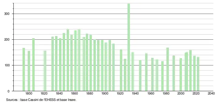 - ↑ Fiches Insee - Populations de référence de la commune pour les années 2006, 2007, 2008, 2009, 2010, 2011, 2012, 2013, 2014, 2015, 2016, 2017, 2018, 2019, 2020, 2021 et 2022.