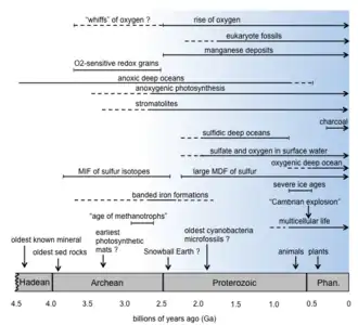 L'étude met également l'accent sur les interactions biosphère / géosphère / atmosphère à travers l'histoire de la Terre telle qu'elle est conservée dans les roches sédimentaires. Un exemple d'une telle interaction est l'introduction du dioxygène dans l'atmosphère au cours de l'ère archéenne par des bactéries photosynthétiques. Cette oxygénation de l'atmosphère de la Terre primordiale (appelée la catastrophe de l'oxygène, une catastrophe écologique appelée aussi Grande Oxydation) peut avoir entraîné la précipitation de formations rocheuses ferrugineuses.