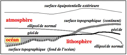 La surface des océans — qui constitue à elle seule environ 70 % de la surface terrestre totale — est généralement assez proche d'une surface de niveau, c'est-à-dire d'une surface équipotentielle du champ de pesanteur. En effet, la surface des océans et des mers est contrôlée essentiellement par la force de pesanteur, avec quelques phénomènes perturbateurs tels les courants marins, les variations de salinité, les marées, la houle causée par les vents, les variations de la pression atmosphérique, etc. Ces phénomènes perturbateurs ne sont pas tous périodiques dans le temps, de sorte que le niveau moyen de la mer, notion donc difficile à définir, ne représente pas une surface équipotentielle du champ de pesanteur avec la précision de mesure actuelle des satellites (de l'ordre du centimètre). On définit ainsi le « géoïde » comme étant une surface équipotentielle du champ de pesanteur, choisie arbitrairement, mais très proche du niveau des océans que, par la pensée, nous pouvons prolonger sous les continents. C'est cette surface physique que l'ingénieur-géodésien allemand J.B. Listing a appelé en 1873 le géoïde. Cette surface avait d'ailleurs déjà servi de surface de référence avant d'être nommée. Ainsi, en 1828, C.F. Gauss se rapporte explicitement dans les termes suivants au géoïde, sans lui attribuer de nom particulier : « Ce que nous appelons surface terrestre au sens géométrique n'est rien de plus que la surface qui intersecte partout la direction de la pesanteur à angle droit, et une partie de cette surface coïncide avec la surface des océans ».