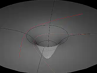 En physique, la géodésique est une généralisation de cette application terrestre[6]. Une particule qui n'est soumise à l'action d'aucune force, mais est astreinte à se déplacer sur une surface, décrit par inertie une géodésique de cette surface[7] ; cette même particule, sous l'action d'un champ de force, possède une énergie mécanique constante, et sa trajectoire, ou son orbite, est donc astreinte à se tenir sur la surface équipotentielle définie par cette énergie. Et en vertu du principe de moindre action, sa trajectoire est une géodésique de cette surface[8]. Au lieu, en somme, d'avoir un obstacle matériel à contourner, il s'agit, par exemple, d'un champ de force modifiant la trajectoire.