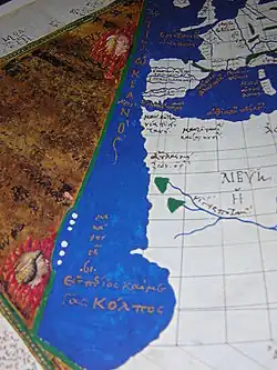 À la fin du XIIe siècle, dans l'Empire byzantin, on trouve encore une mention de la Géographie (une transposition en vers de quelques passages), dans l'ouvrage de Jean Tzétzès, Chiliades. Mais ce sera tout jusque vers 1300, où des versions grecques de Ptolémée sont retrouvées par l'érudit byzantin Maximus Planudes. Il dessinera les cartes perdues en se basant sur ces textes. Après la traduction en latin de la Cosmographie (c'est alors son nom) par Manuel Chrysoloras, achevée par son élève Jacopo d'Angelo da Scarperia[14] en 1406, plusieurs cartes sont à nouveau dessinées (voir illustration ci-contre). Cette traduction est imprimée pour une première fois en 1475, et les cartes le seront encore régulièrement. Les sciences cartographiques prennent à ce moment-là de l'ampleur[15], dans un contexte de développement des explorations territoriales par le monde occidental.