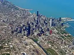 Le lac Michigan a permis l'installation du port de Chicago et le développement d'activités de loisirs, ce qui a contribué à diversifier la base industrielle en croissance rapide de Chicago[9]. Le port utilise également les voies navigables qu'offrent le canal Illinois et Michigan, la rivière Chicago, la rivière Calumet et le lac Calumet (la plus grande étendue d'eau sur le territoire de la ville). Il manipule quelque 100 Mt en provenance ou à destination des autres ports des Grands Lacs et relie les ports de la côte atlantique au golfe du Mexique par le fleuve Mississippi[10]. Avec l'essor des chemins de fer peu de temps après, la ville est devenue la plaque tournante ferroviaire du pays. Chicago est aussi un important carrefour de liaisons aériennes et compte quatre aéroports internationaux dans son agglomération dont les plus importants sont l'aéroport international O'Hare (quatrième aéroport du monde par le nombre de passagers[11]) et l'aéroport international Midway. Chicago a continué d'être le carrefour de l'Amérique, ce qui a facilité la transition de la ville vers une économie post-industrielle[9].