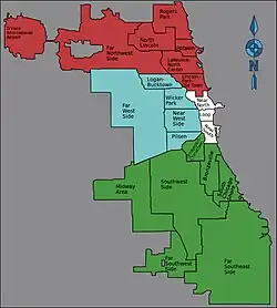 Le territoire de la ville de Chicago est subdivisé en quatre sections géographiques, 50 wards, 77 secteurs communautaires et environ 228 quartiers. Les sections, les secteurs et les quartiers sont des divisions strictement géographiques ou statistiques. Seuls les wards (ou « districts ») sont une division administrative et politique, en effet le conseil municipal de Chicago (Chicago City Council) se compose de 50 conseillers qui représentent chacun un ward au Conseil de la ville (Government of Chicago). On peut dire, d'une façon générale, qu'une section géographique est composée de plusieurs secteurs communautaires lesquels sont composés de plusieurs quartiers. Un quartier peut s'étendre sur deux secteurs communautaires, en revanche un secteur ne peut déborder sur deux sections géographiques. La ville est couverte par deux indicatifs téléphoniques régionaux : l'indicatif 312 (qui couvre la zone correspondant approximativement à Downtown Chicago) et l'indicatif 773 (qui coïncide avec tout le reste du territoire de la ville de Chicago, hormis Downtown). Enfin, les communes résidentielles de Norridge et de Harwood Heights sont enclavées dans la ville de Chicago (dans sa partie nord-ouest) ; limitrophes l'une de l'autre, elles sont encerclées par les secteurs de Norwood Park au nord, Dunning au sud, Portage Park au sud-est, Jefferson Park au nord-est, et O'Hare à l'ouest.