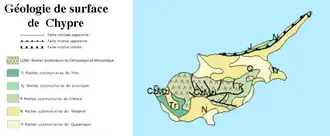 On retrouve une grande variété de paysages, avec les massifs montagneux du Troodos et de Kyrenia qui s’élèvent sous la force tectonique exercée par les plaques africaine et eurasienne ; la presqu'île de Karpassia/Kırpaşa est un rebord de faille. La chaîne Kyrenia est essentiellement calcaire, tandis que la chaîne de Troodos est composée d'une roche métamorphique verte riche en cuivre (ophiolite), et entre les deux la plaine de Mésorée est essentiellement sédimentaire et agricole (datant de l'Holocène)[2].