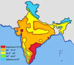 L'été dure de mars à juin dans la plus grande partie de l'Inde. Les températures dépassent 40 °C pendant la journée. Les régions côtières dépassent les 30 °C avec des taux d'humidité très élevés. Dans la région du désert du Thar, les températures peuvent dépasser 45 °C.