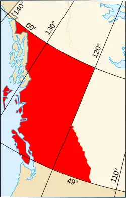 - Limite ouest : elle correspond pour sa moitié sud à la côte Pacifique qui est très découpée, elle est longée dans son quart sud par l'île de Vancouver qui lui est parallèle. La moitié nord de la limite ouest correspond à la frontière avec l'Alaska du sud-est.