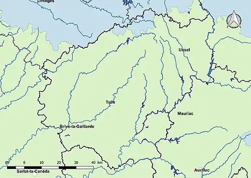 Le département de la Corrèze dispose de 5000 kilomètres de cours d'eau variés[2]. Ces cours d'eau sont nombreux (Corrèze, Vézère, Dordogne) et dépendent du réseau hydrographique de la Garonne. Ils connaissent un régime irrégulier, souvent torrentiel, et coulent au fond de vallées encaissées. Le climat de montagne présente déjà certains aspects méridionaux. Il reçoit des influences océaniques sensibles dans le bassin de Brive. Les pentes et vallées tournées vers l'Aquitaine bénéficient de conditions climatiques plus favorables.