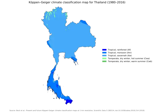 Le climat de la Thaïlande est influencé par les vents de mousson qui ont un caractère saisonnier (mousson du sud-ouest et du nord-est). La majeure partie du pays est classée comme climat de savane tropicale de Köppen . La majorité du sud ainsi que la pointe orientale de l'est ont un climat tropical de mousson . Certaines parties du sud ont également un climat de forêt tropicale humide .