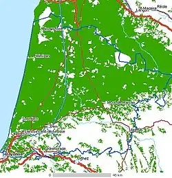 C'est cette partie, la plus vaste du département, qui lui a donné son nom. Elle correspondait à l'époque à un paysage de lande, avant la plantation des pins consécutive à la loi du 19 juin 1857. Elles se composent :