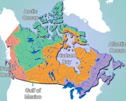 Les cinq bassins versants du Canada sont les suivants : les bassins de l'Atlantique, du Pacifique, de l'Arctique, de la baie d'Hudson et du golfe du Mexique.