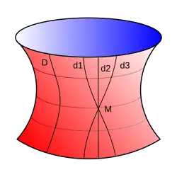 Plus généralement, l'ensemble des points à égale distance (spatio-temporelle) de A est un hyperboloïde, alors que dans le cas euclidien, l'ensemble des points à égale distance d'un centre définit une sphère.