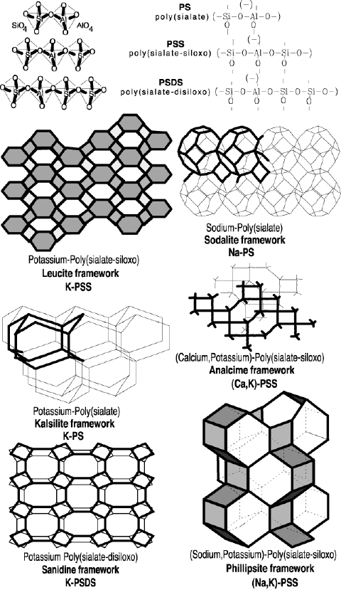 Parmi les géopolymères, ceux basés sur les aluminosilicates sont désignés sous le terme « poly(sialate) », l'abréviation de poly(silico-aluminate) ou (-Si-O-Al-O-)n (où n est le degré de polymérisation). La structure chimique de la figure 1 montre un géopolymère poly(sialate-siloxo) résultant d'une géosynthèse d'acide poly(silicique) (SiO2)n et d'aluminosilicate de potassium, en milieu alcalin (KOH, NaOH). Dans cette structure, le groupement sialate (Si-O-Al-O-) constitue un pont entre deux chaines de silice et contribue ainsi à la réticulation de la structure du géopolymère.