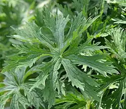 Les feuilles opposés, palmatipartites, de 6-11 cm, sont formées de 5-7 segments larges, incisés-dentés[3].