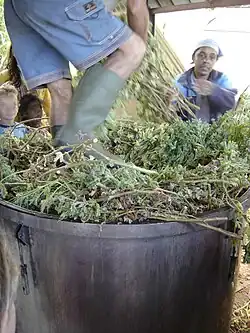 À La Réunion, la distillation à la vapeur est faite traditionnellement dans de petits alambics en cuivre (maintenant en inox). Dans une cuve d'environ 800 litres, on presse 3 à 400 kg de feuilles au-dessus d'une claie, disposée au-dessus de 250 l d'eau au fond de la cuve[10]. En-dessous, on entretient un feu avec des branches d'acacia. Lorsque l'eau bout, la vapeur fait éclater les poils glanduleux des feuilles et entraine les huiles essentielles volatiles dans un col de cygne. Les vapeurs descendent ensuite par un serpentin placé dans une cuve d'eau froide et se condensent. La séparation de l'huile essentielle de la petite eau se fait simplement dans un vase florentin, dans lequel l'huile plus légère, montée en surface, s'écoule à l'extérieur. Une « cuite » dure plus de trois heures.