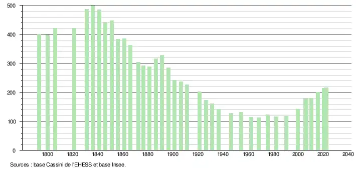 L'évolution du nombre d'habitants est connue à travers les recensements de la population effectués dans la commune depuis 1793. Pour les communes de moins de 10 000 habitants, une enquête de recensement portant sur toute la population est réalisée tous les cinq ans, les populations de référence des années intermédiaires étant quant à elles estimées par interpolation ou extrapolation[18]. Pour la commune, le premier recensement exhaustif entrant dans le cadre du nouveau dispositif a été réalisé en 2005[19].