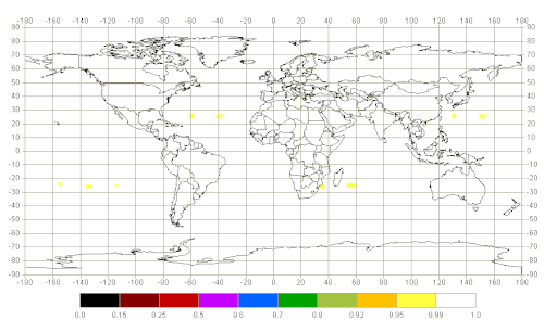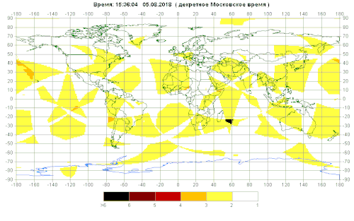 Carte représentant les valeurs du GDOP à la surface de la terre (angle de masquage : 5°) le 30 mars 2010 à 19 h 6 min 46 s UTC.