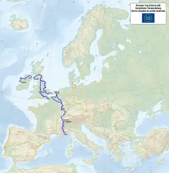Du Nord au Sud, il parcourt ainsi les Pays-Bas, la Belgique, le Luxembourg, la France où il traverse les Vosges et le Jura, la Suisse où il passe au bord du lac Léman, puis à nouveau la France à travers les Alpes jusqu'à la Méditerranée.