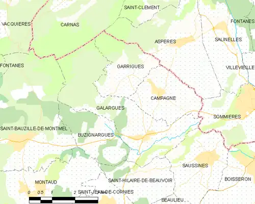 L’inventaire des zones naturelles d'intérêt écologique, faunistique et floristique (ZNIEFF) a pour objectif de réaliser une couverture des zones les plus intéressantes sur le plan écologique, essentiellement dans la perspective d’améliorer la connaissance du patrimoine naturel national et de fournir aux différents décideurs un outil d’aide à la prise en compte de l’environnement dans l’aménagement du territoire. Deux ZNIEFF de type 1[Note 2] sont recensées sur la commune[10] : l'« aven du Mounmaou » (280 ha), couvrant 3 communes dont une dans le Gard et deux dans l'Hérault[11] et la « plaine de Campagne » (1 681 ha), couvrant 6 communes dont trois dans le Gard et trois dans l'Hérault[12] et une ZNIEFF de type 2[Note 3],[10] : les « plaines et garrigues du Nord Montpelliérais » (13 097 ha), couvrant 25 communes dont six dans le Gard et 19 dans l'Hérault[13].