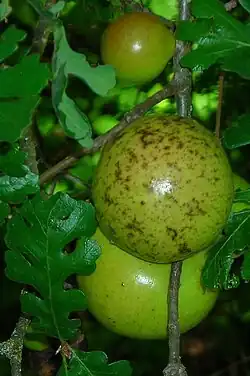 Dans l'hémisphère nord, et en zone tempérée, les galles les plus connues sont les galles du chêne (ou « noix de galle », « galle du Levant »), généralement produites par des Cynips, Cynips quercusfolii, Biorhiza pallida « la galle de la pomme de chêne », ou Andricus kollari[21]. Sur les divers chênes d'Europe moyenne on dénombre environ 250 variétés de galles, dont 200 sont de la famille des Cynips. Elles poussent sur les feuilles ou à leur aisselle, et sont sphériques, évoquant la forme d'une petite pomme de 1 à 5 cm. Une autre galle très fréquente en région méditerranéenne provient du parasitage du chêne par Andricus dentimitratus. Les excroissances rougeâtres et collantes, en forme de dents, qui enveloppent le gland sont à l'origine du nom de cet insecte.