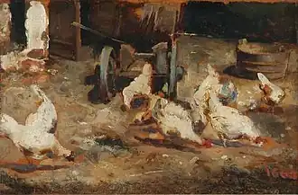 La peinture a une volaille avec 6 poules blanches mangeant du grain sur le sol. À l'arrière d'un camion et un bol en bois. Cette boîte peut très bien être une étude pour les poulets reproduite dans l'huile Ferrador Moroccan conserveée dans la collection Gustau Bauser.