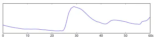Exemple d'enregistrement d'une réponse électrodermale sur une durée 60 secondes. L'ordre de grandeur du potentiel électrique mesuré par le galvanomètre sur l'axe des ordonnées est le millivolt.