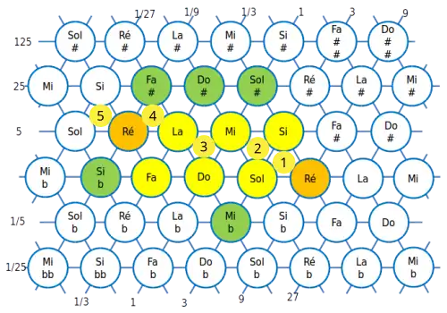 | Quarte | 4/3 = Fa | 2/1 = Do | 16/9 = Si♭ | 5/3 = La | 10/9 = Ré |