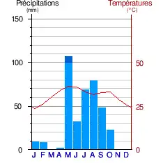 | Température moyenne (°C) | 23,7 | 26,5 | 30,2 | 34 | 36,3 | 35,8 | 33,3 | 31,6 | 32,9 | 33 | 28,7 | 25 | 30,9 |