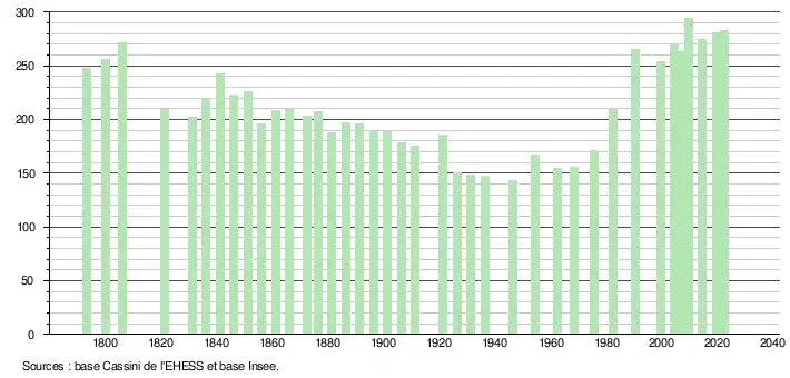 L'évolution du nombre d'habitants est connue à travers les recensements de la population effectués dans la commune depuis 1793. Pour les communes de moins de 10 000 habitants, une enquête de recensement portant sur toute la population est réalisée tous les cinq ans, les populations de référence des années intermédiaires étant quant à elles estimées par interpolation ou extrapolation[22]. Pour la commune, le premier recensement exhaustif entrant dans le cadre du nouveau dispositif a été réalisé en 2004[23].