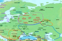 Carte montrant les établissements varègues ou Rus' (en rouge) et les emplacements des tribus slaves (en gris) au milieu du IXe siècle. L'aire d'influence des Khazars est entourée en bleu