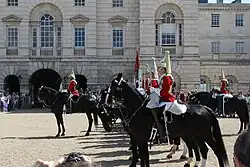 Au moment du changement de garde, l'ancienne garde se forme du côté nord de l'enceinte sur Horse Guards Parade et la nouvelle garde du côté sud. À l'arrivée de la nouvelle garde, chaque garde porte l'étendard et les trompettistes de l'ancienne et de la nouvelle garde sonnent le salut royal à l'arrivée de la nouvelle garde et au départ de l'ancienne garde. Lorsque les deux gardes se sont formés dans l'enceinte, le caporal-major, le sous-officier supérieur et les sentinelles de la première relève de la nouvelle garde partent pour la salle des gardes, qui est alors remise. Les sentinelles de la vieille garde, après avoir été relevées, rejoignent le reste de la vieille garde du côté nord de l'enceinte. L'étendard et les trompettistes ne paradent qu'avec une longue garde.