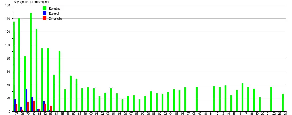 Le graphique et le tableau montrent le nombre de passagers qui en moyenne embarquent durant la semaine, le samedi et le dimanche[8].