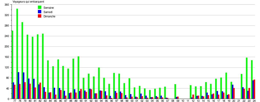 Le graphique et le tableau montrent le nombre de passagers qui en moyenne embarquent durant la semaine, le samedi et le dimanche[10].