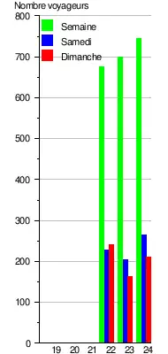 Ce graphique et tableau montre le nombre de voyageurs embarquant en moyenne durant la semaine, le samedi et le dimanche[5].