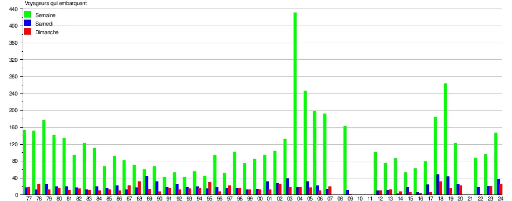 Le graphique et le tableau montrent le nombre de passagers qui en moyenne embarquent durant la semaine, le samedi et le dimanche[5].