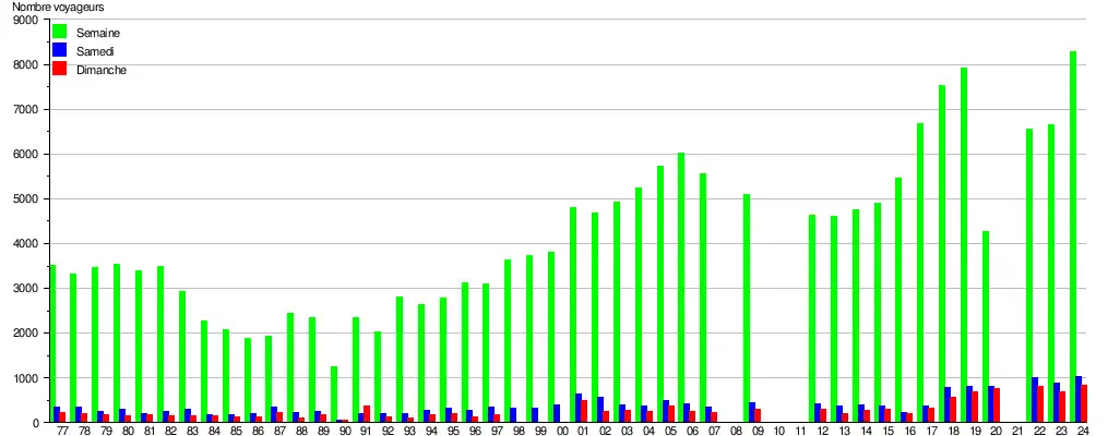 Ce graphique et tableau montre le nombre de voyageurs embarquant en moyenne durant la semaine, le samedi et le dimanche[9].