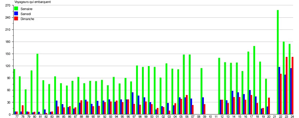 Le graphique et le tableau montrent le nombre de passagers qui en moyenne embarquent durant la semaine, le samedi et le dimanche[4].