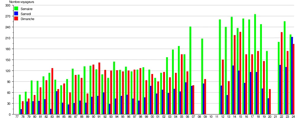 Ce graphique et tableau montre le nombre de voyageurs embarquant en moyenne durant la semaine, le samedi et le dimanche[4].