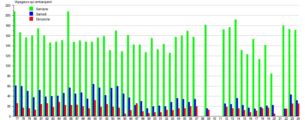 Le graphique et le tableau montrent le nombre de passagers qui en moyenne embarquent durant la semaine, le samedi et le dimanche[6].