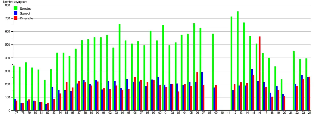 Ce graphique et tableau montre le nombre de voyageurs embarquant en moyenne durant la semaine, le samedi et le dimanche[9].