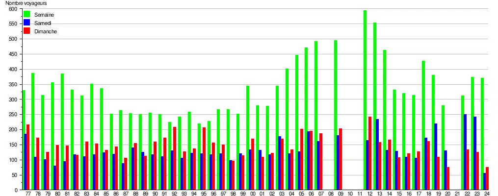 Ce graphique et tableau montre le nombre de voyageurs embarquant en moyenne durant la semaine, le samedi et le dimanche[3].