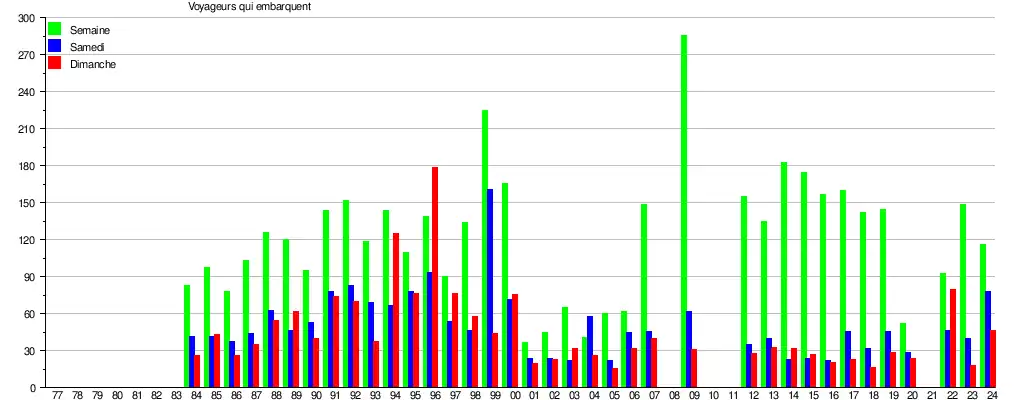 Le graphique et le tableau montrent le nombre de passagers qui en moyenne embarquent durant la semaine, le samedi et le dimanche[6].