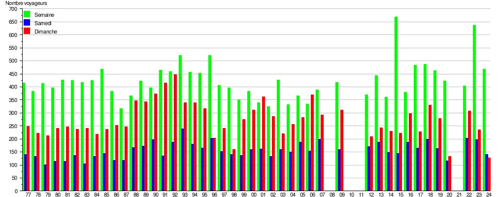 Ce graphique et tableau montre le nombre de voyageurs embarquant en moyenne durant la semaine, le samedi et le dimanche[8].