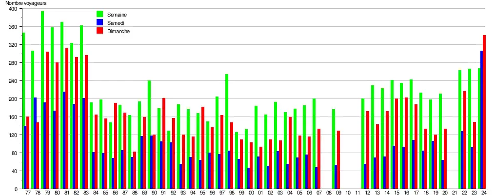 Ce graphique et tableau montre le nombre de voyageurs embarquant en moyenne durant la semaine, le samedi et le dimanche[11].