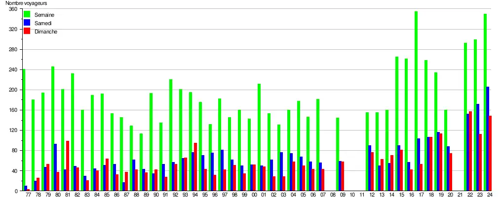 Ce graphique et tableau montre le nombre de voyageurs embarquant en moyenne durant la semaine, le samedi et le dimanche[9].