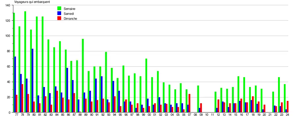 Le graphique et le tableau montrent le nombre de passagers qui en moyenne embarquent durant la semaine, le samedi et le dimanche[12].