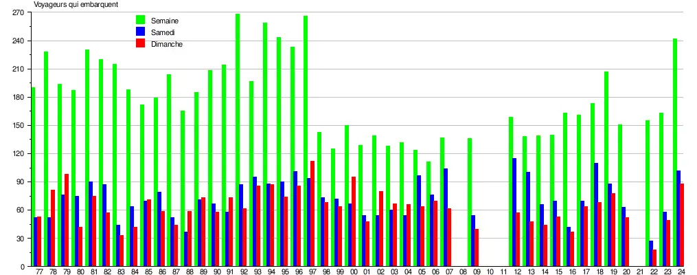 Le graphique et le tableau montrent le nombre de passagers qui en moyenne embarquent durant la semaine, le samedi et le dimanche[6].