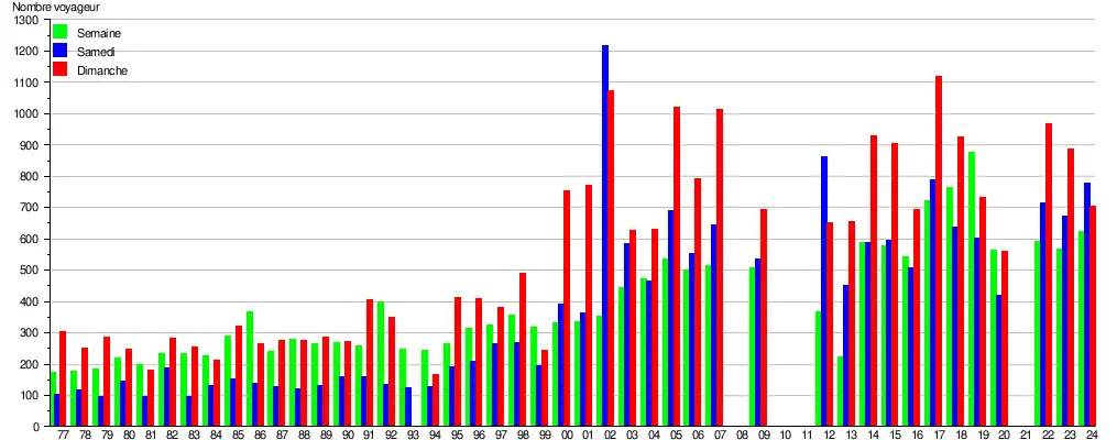 Ce graphique et tableau montre le nombre de voyageurs embarquant en moyenne durant la semaine, le samedi et le dimanche[7].